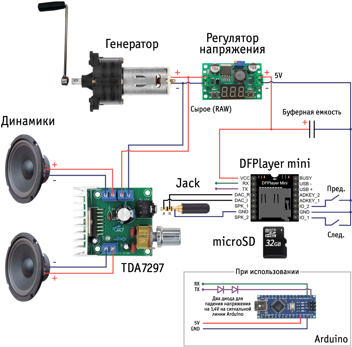 Если у генератора есть регулятор напряжения, как в нашем случае, его можно выставить на типовое напряжение работы электронных составляющих (MP3-плеер, микроконтроллер), которое обычно составляет 5В. Питание усилителя можно брать нерегулируемое, так как обычно допустимое может быть около 20В, а развить большую мощность тока от ручного генератора такого класса, способную повредить усилитель, скорее всего, будет невозможно. Зато будет очень ощутимая обратная связь громких и интенсивных моментов в музыке и усилия на ручке генератора.